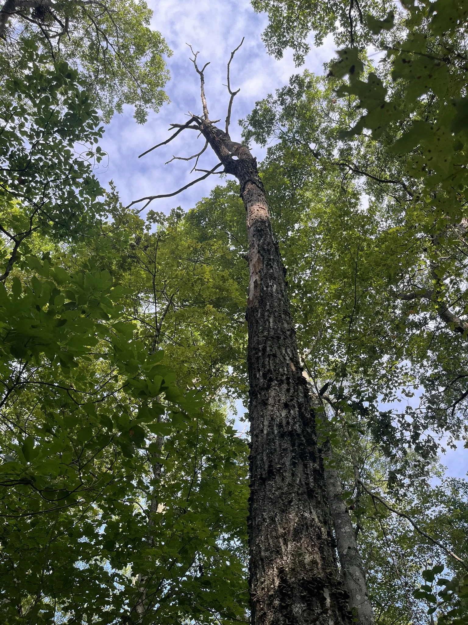 A tall, dead tree with few branches extends upward among green foliage under a partly cloudy sky.