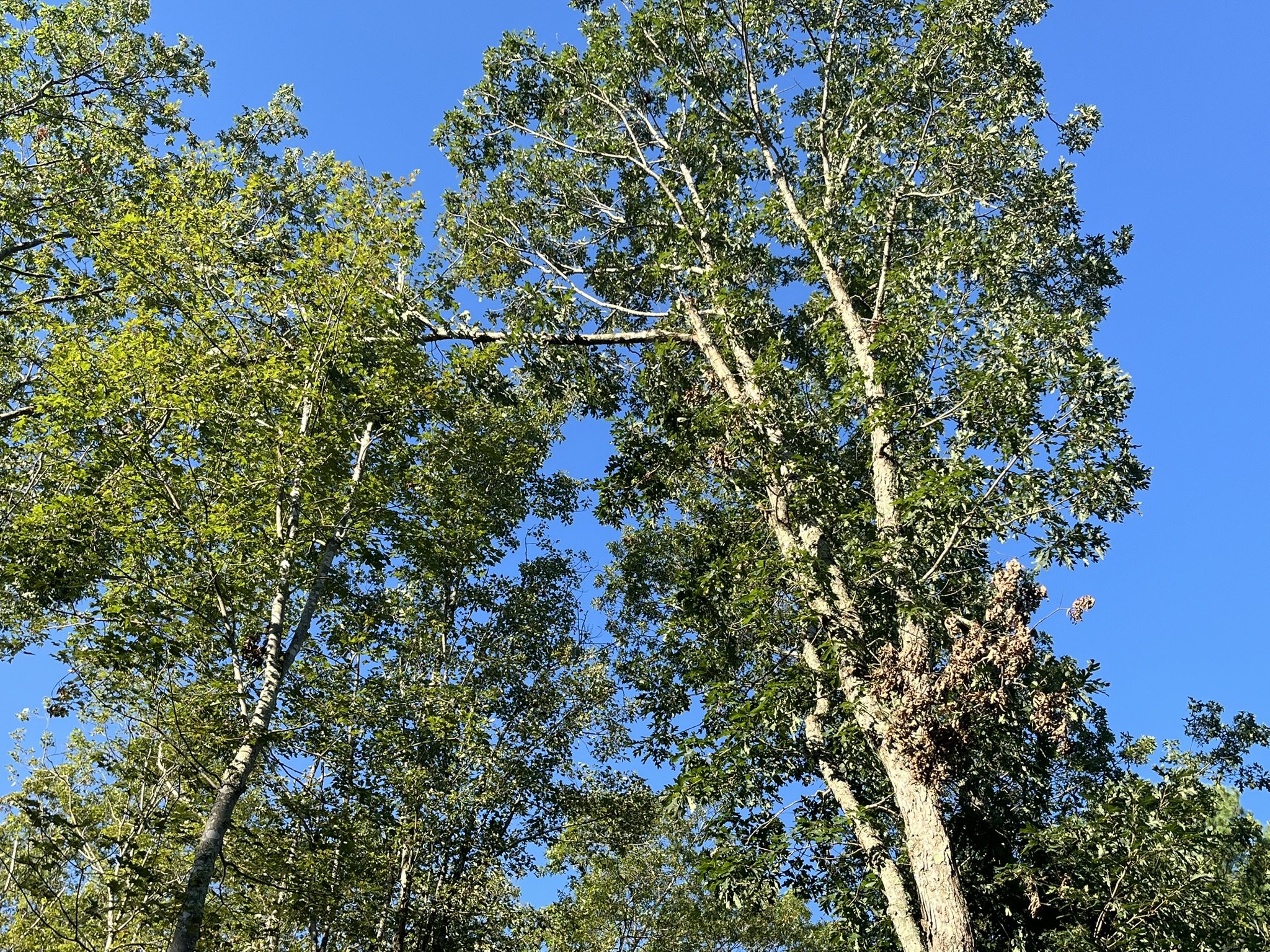 Tall trees with green leaves under a clear blue sky.