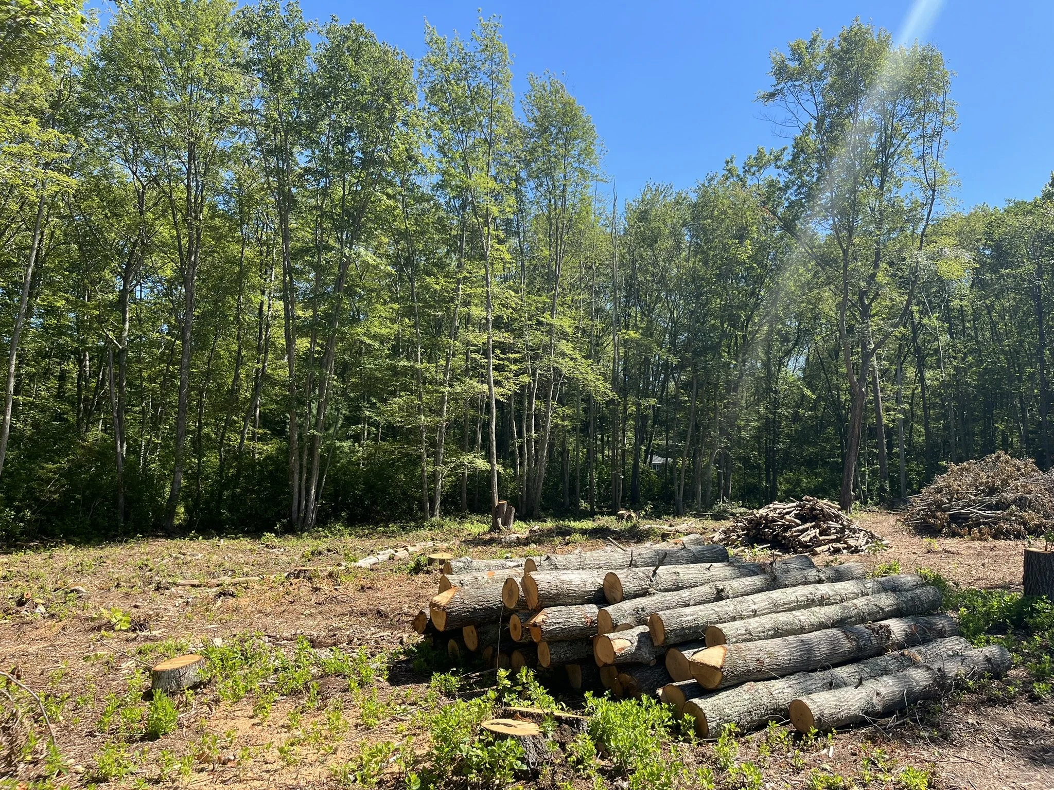 Piles of cut logs stacked on the ground in a cleared forest area, with dense trees and a bright blue sky in the background.