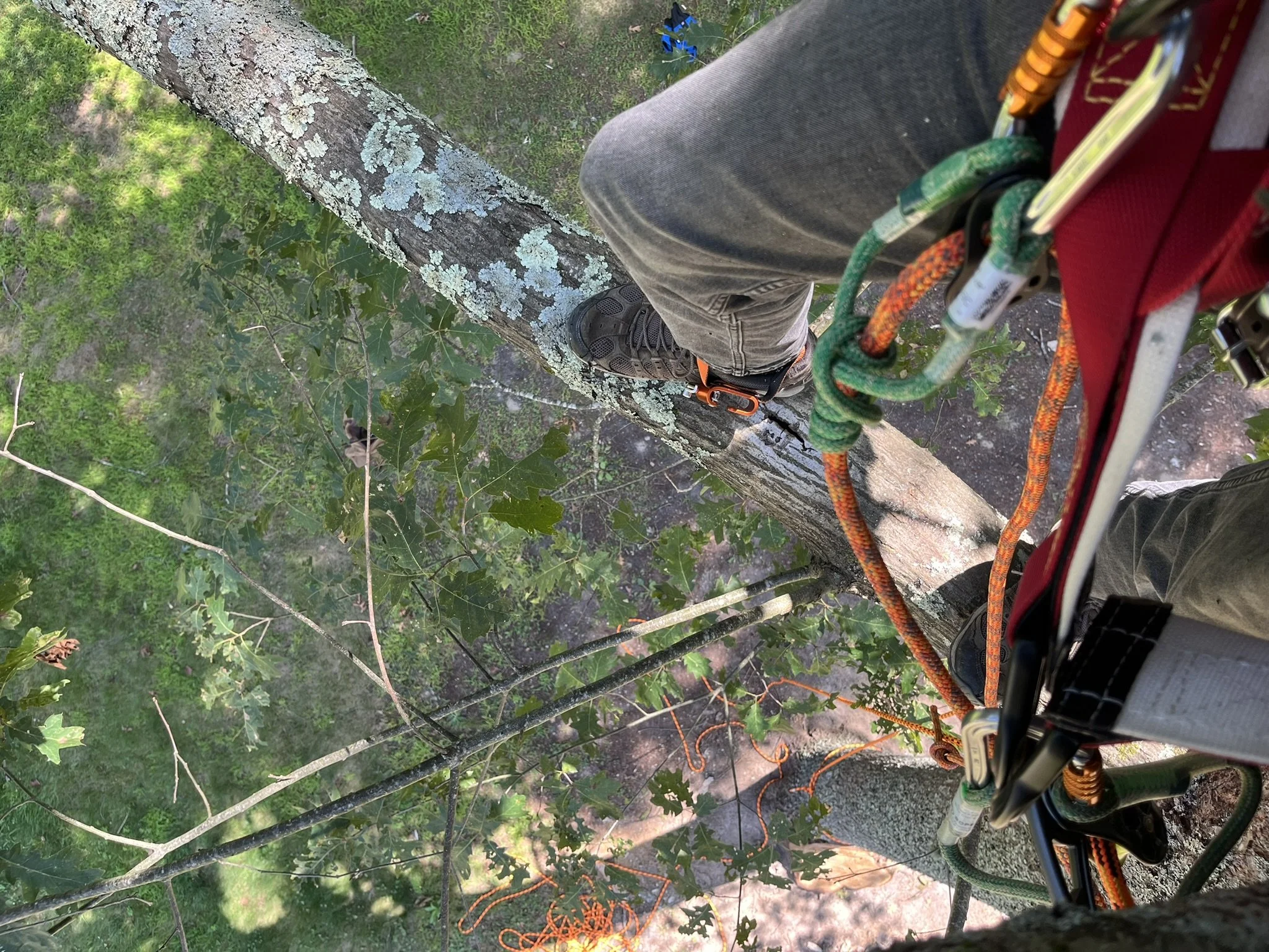 A person climbing a tall tree using climbing equipment, including ropes and harnesses, with green foliage and branches visible below.