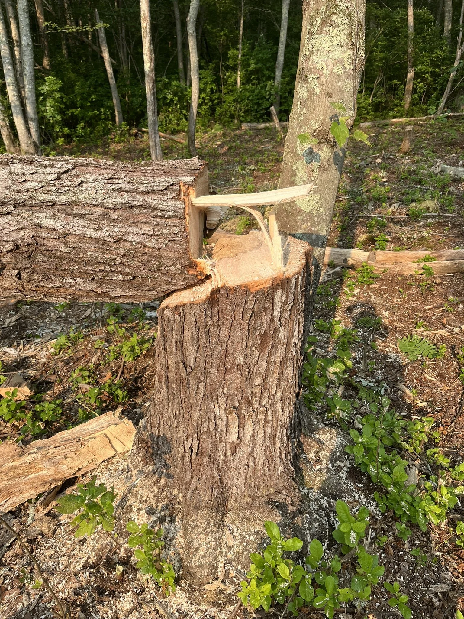 A tree that has been cut down recently with a chainsaw, with a branch that was cut off and a piece of wood attached to the trunk, in a forest with green foliage in the background.