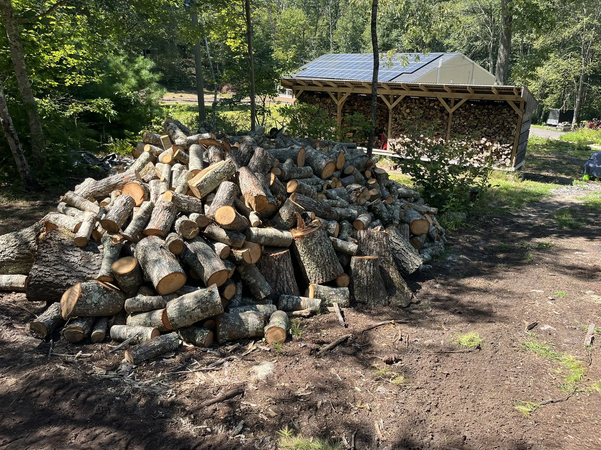 A large pile of cut firewood logs stacked near a wooded area with trees and a structure with solar panels on the roof in the background.